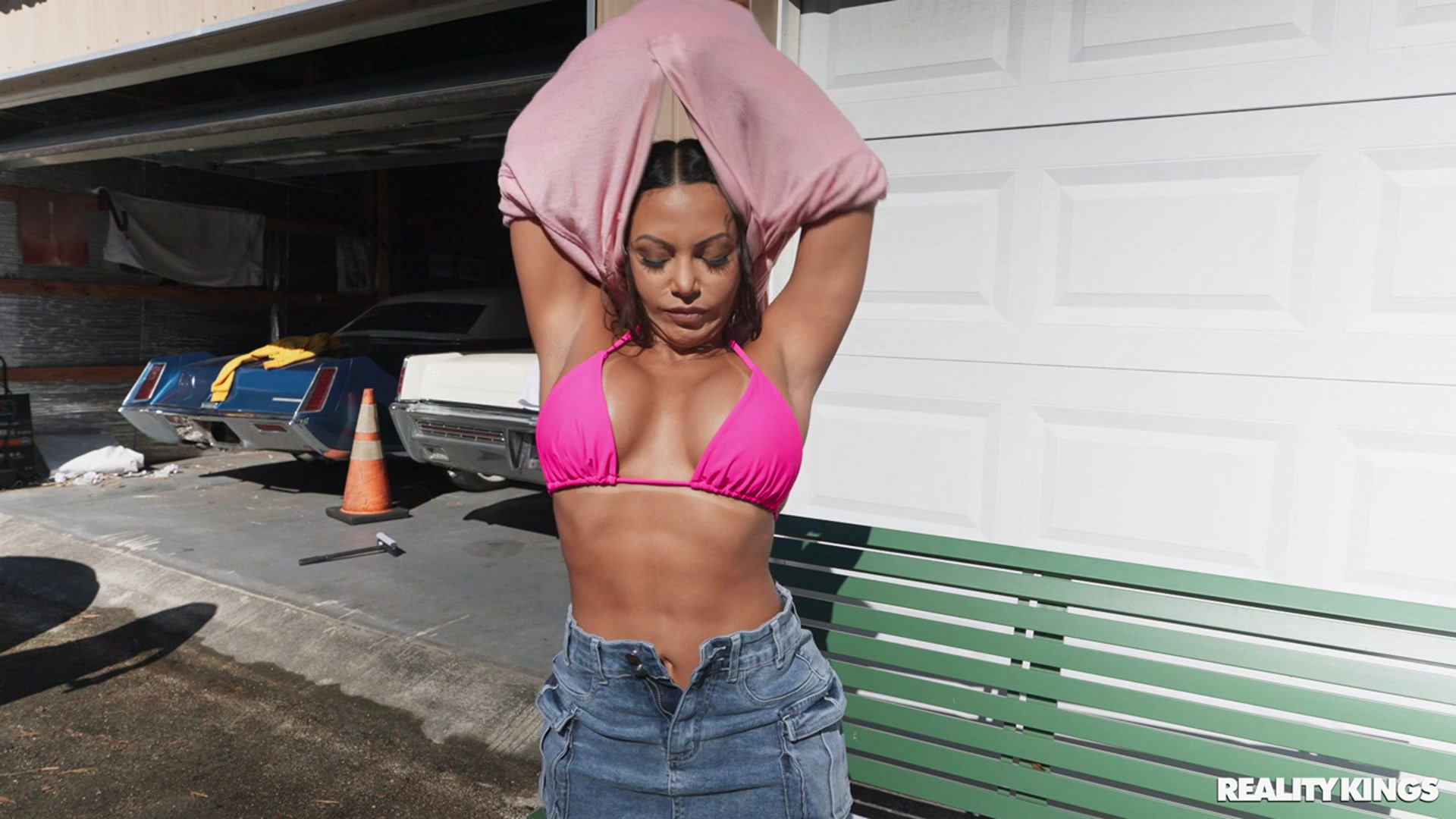 Brandy Salazar’s buddy Mike Skywalker drops by to help wash her car, but she eyes him up and decides he looks prime for a good fuck. In her hot pink bikini, she teases him by lathering her fake tits and big booty with suds, then calls him over to drop to her knees and suck his cock deep. He bends her over the hood and pounds her pussy hard from behind, before she begs him to slide into her ass for a rough anal ride. Mike pulls out and blasts a thick facial across her face, leaving the car spotless while this slut stays filthy.